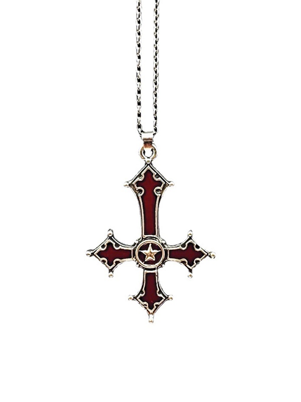 Collar con colgante de cruz invertida rojo sangre