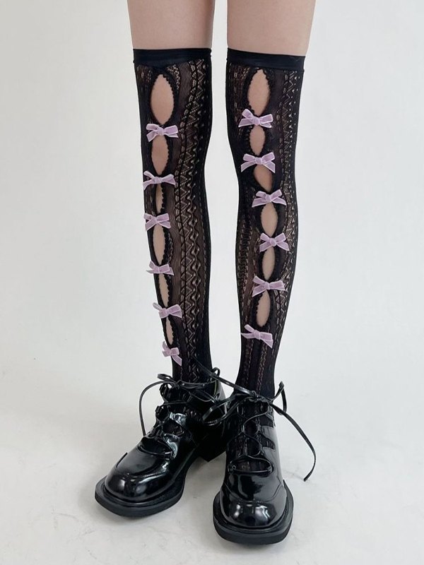 Calcetines altos hasta el muslo con encaje recortado y adorno de lazo