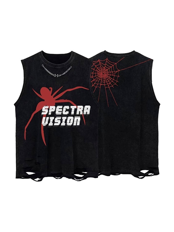 Chaleco rasgado con estampado de araña desgastado y lavado para hombre