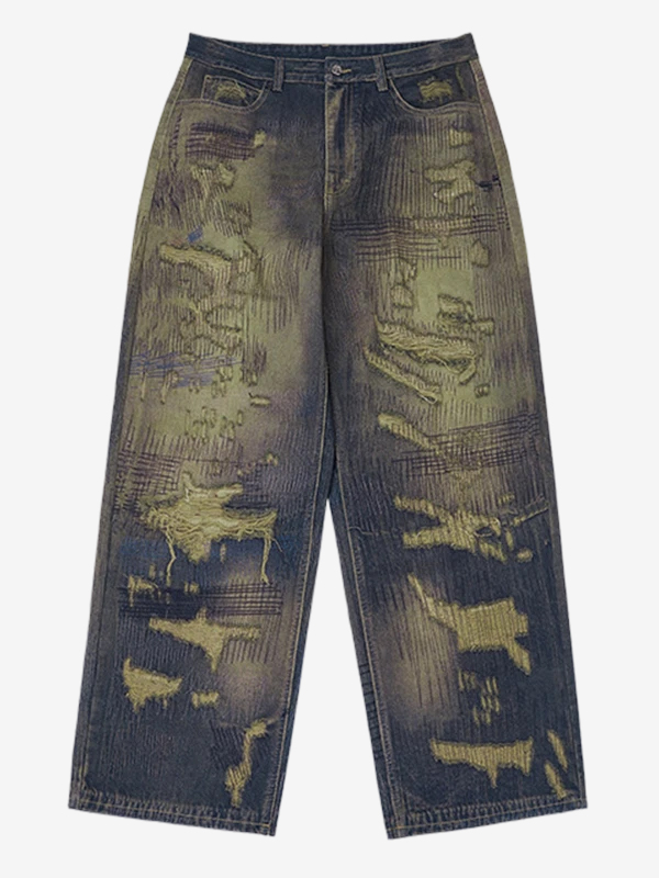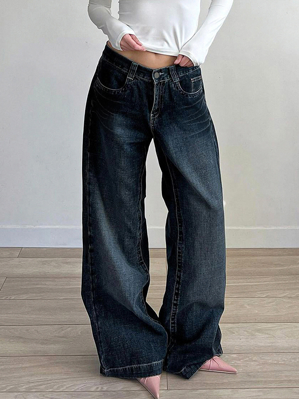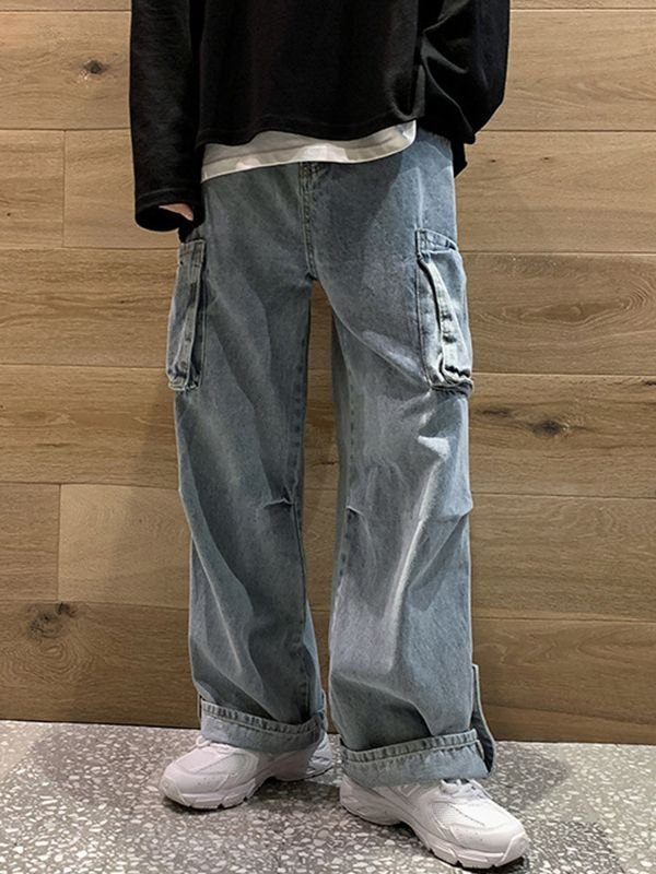 Jeans sueltos con parche de bolsillo lavado para hombre