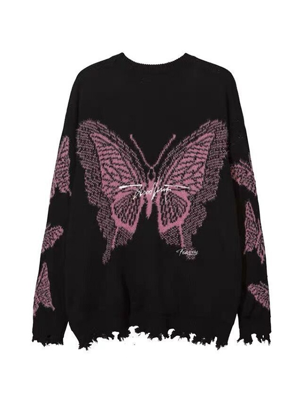 Suéter de hombre con dobladillo deshilachado y estampado de mariposas