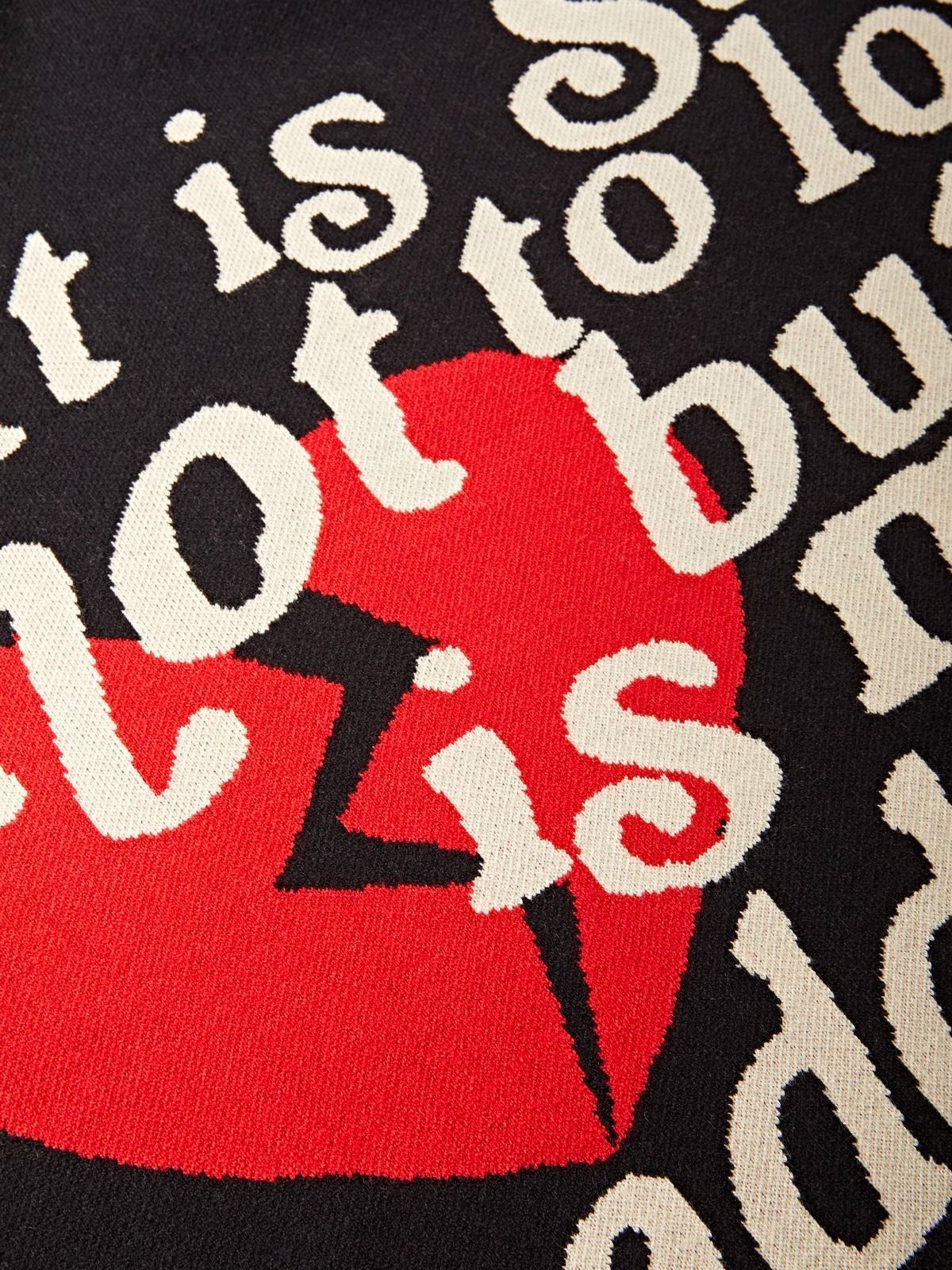 Descripción: Estos jerséis estilo punk street-vibe confeccionados en tejido de punto de algodón, con diseño de mangas caídas, presentan un corazón roto, una letra con eslogan, una calavera y un detalle de llamas en jacquard.