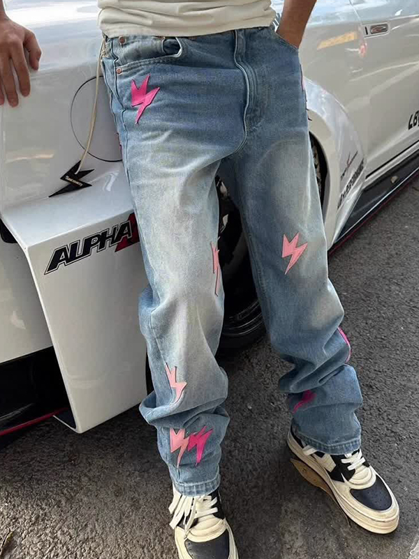 Vaqueros holgados con estampado de relámpagos lavados estilo retro americano