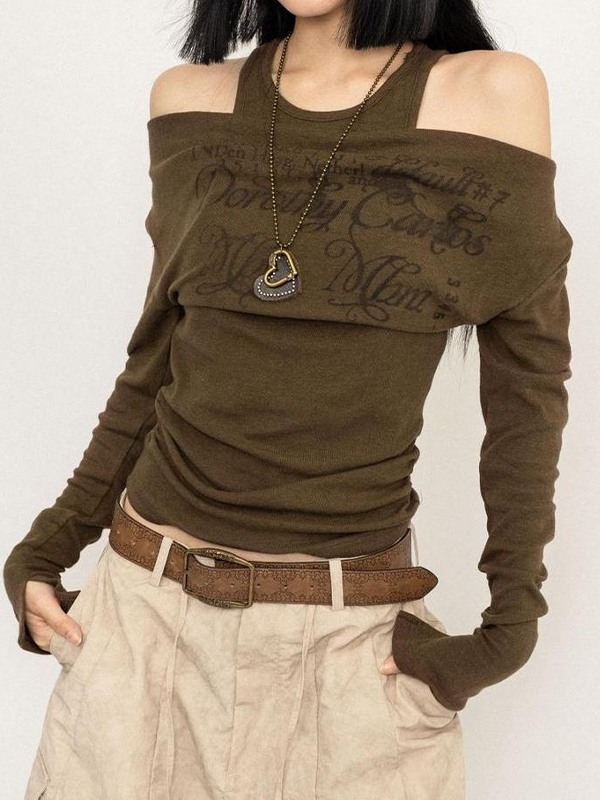 Camiseta de manga larga con estampado falso de dos piezas y un solo hombro
